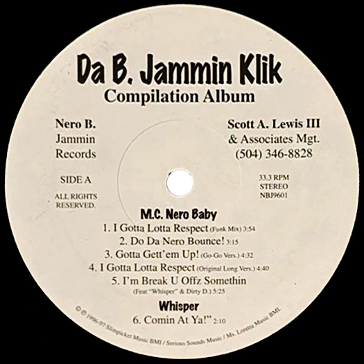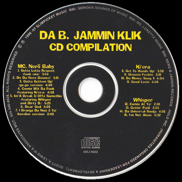 DA B. JAMMIN KLIK – CD COMPILATION (Gotta Lotta Respect (Funk Mix) MC Nero Baby) / Do Da Nero Bounce! MC Nero Baby) / Gotta Gettem Up! (Go-Go Version) MC Nero Baby) / Comin Wit Da Funk MC Nero Baby) / I'm A Break U Offz Somethin MC Nero Baby) / Dear God MC Nero Baby) / I Brangz Da Noiz 2 Ya! (Bassline Version) MC Nero Baby) / Get Yo Handz Up! (Ki'era) / Groovin Feelings (Ki'era) / Da Money Song $ (Ki'era) / Good Lovin (Ki'era) / Comin At Ya! (Whisper) / Gettin' Paid (Whisper) / Da Universal Soulja (Whisper / I'm Not Alone (Whisper)) |